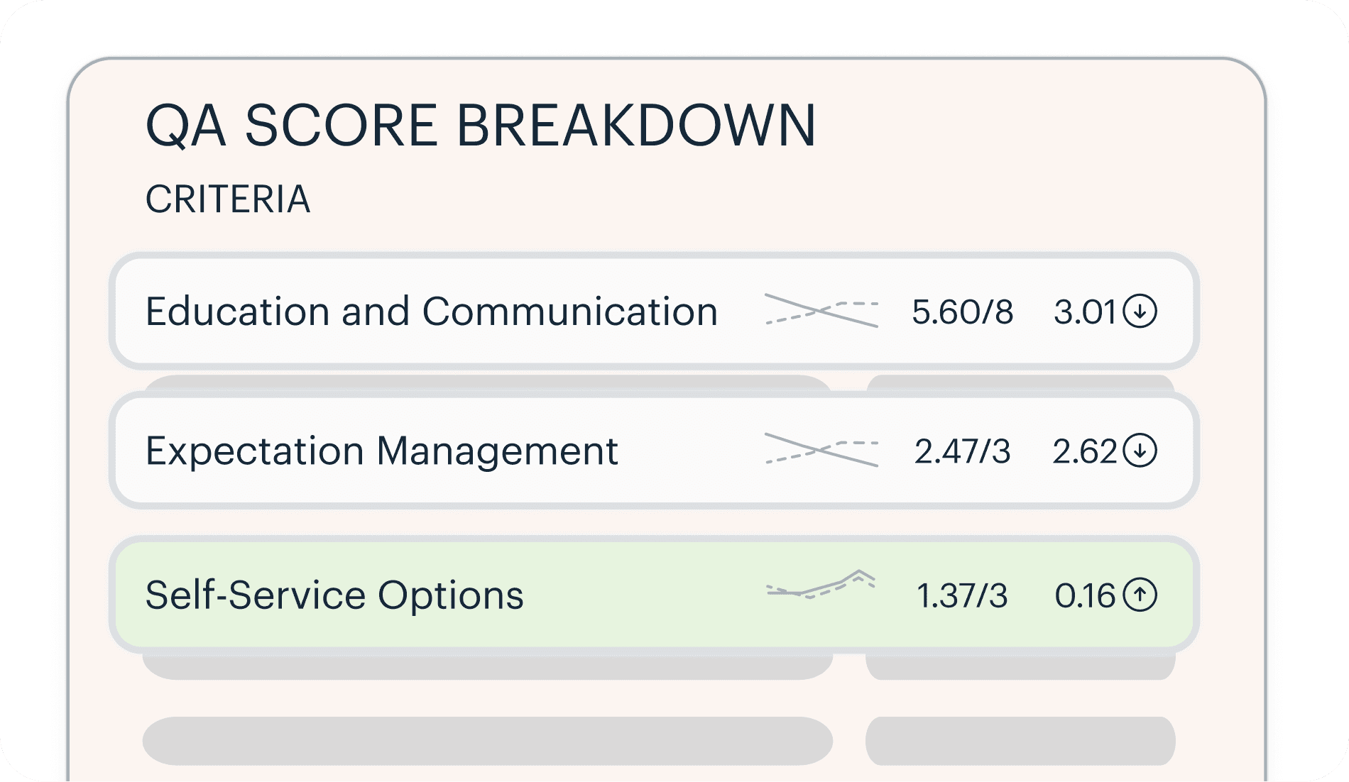 Replaces 1% manual sampling with complete quality analysis. Support leaders track department performance trends. Coaches get individual agent insights highlighting empathy gaps, missed opportunities, and resolution quality.