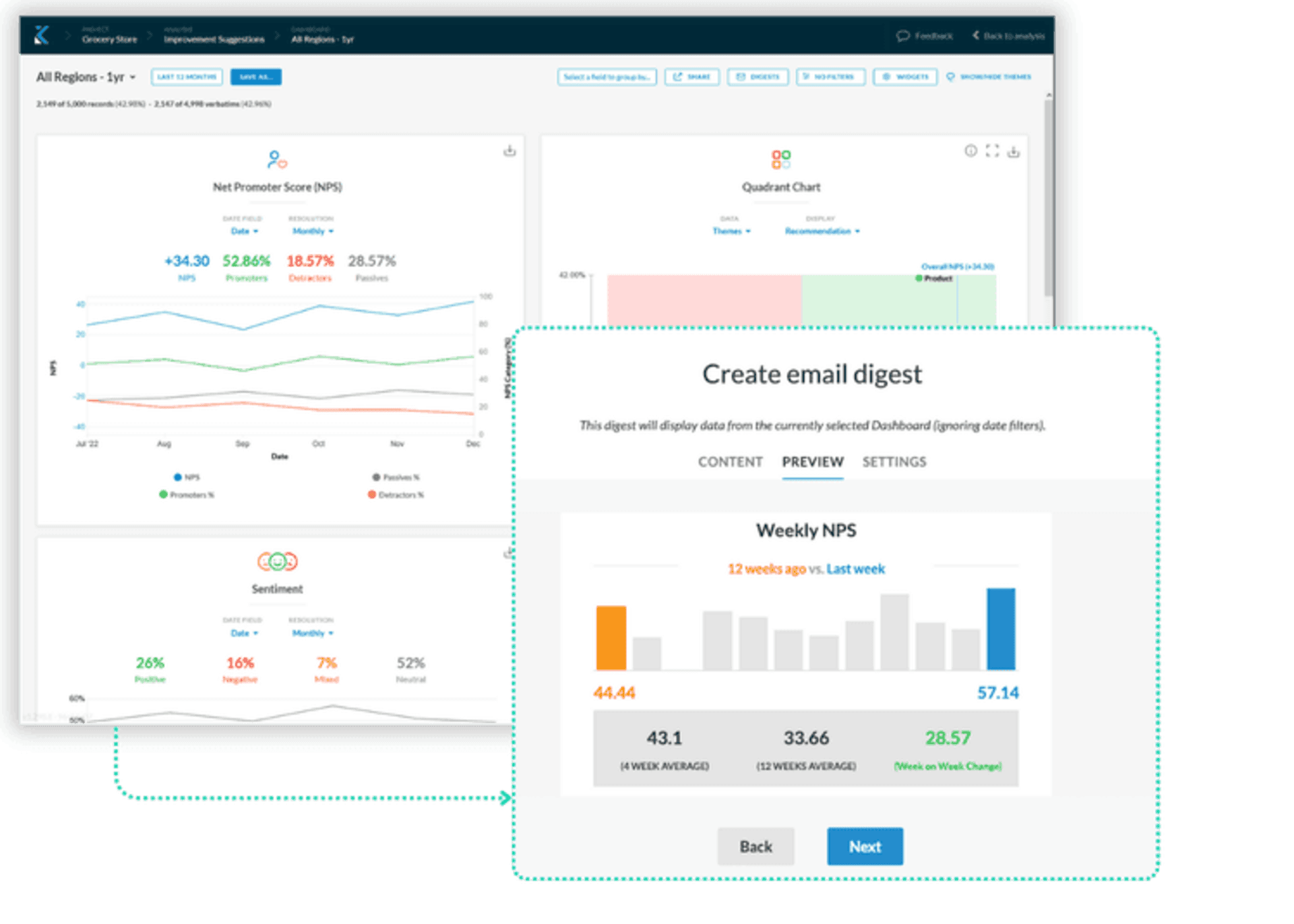 Kapiche reporting capabilities allow organizations to monitor customer sentiment continuously and make decisions based on up-to-date insights. Customizable dashboards enable individuals or teams to track performance against KPIs like NPS, CSAT, and customer retention, and take immediate action.
